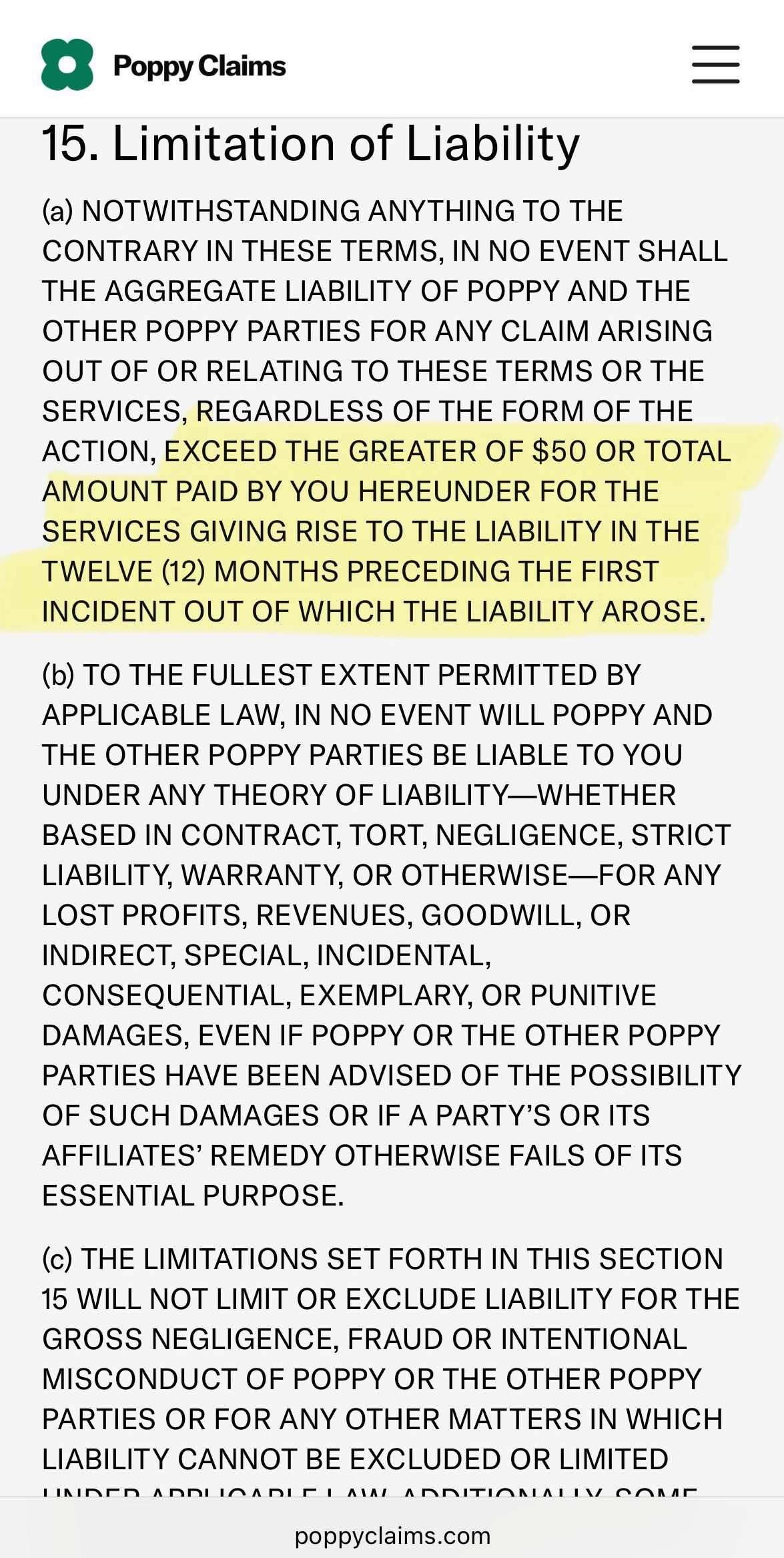 What if they mess up your claim and you lose out big? Their liability is capped at $50 or whatever you paid them (and they also included a waiver and arbitration clause for good measure).